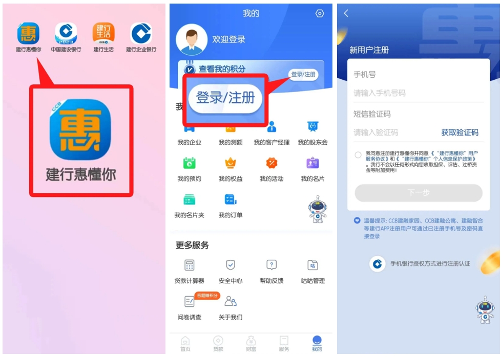 1、下载安装“建行惠懂你”APP,点击“我的-登录/注册”完成注册。