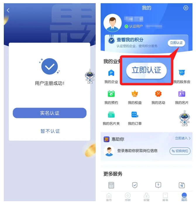 2、在注册成功页面点击“实名认证”,个人实名认证完成后,再通过“我的-立即认证”点击“创建企业”输入企业信息并认证企业。