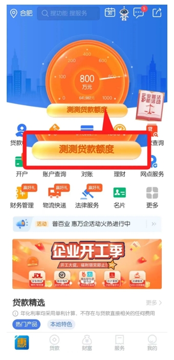 可以在首页点击“测测贷款额度”,选择对应贷款种类提前预测可申请额度